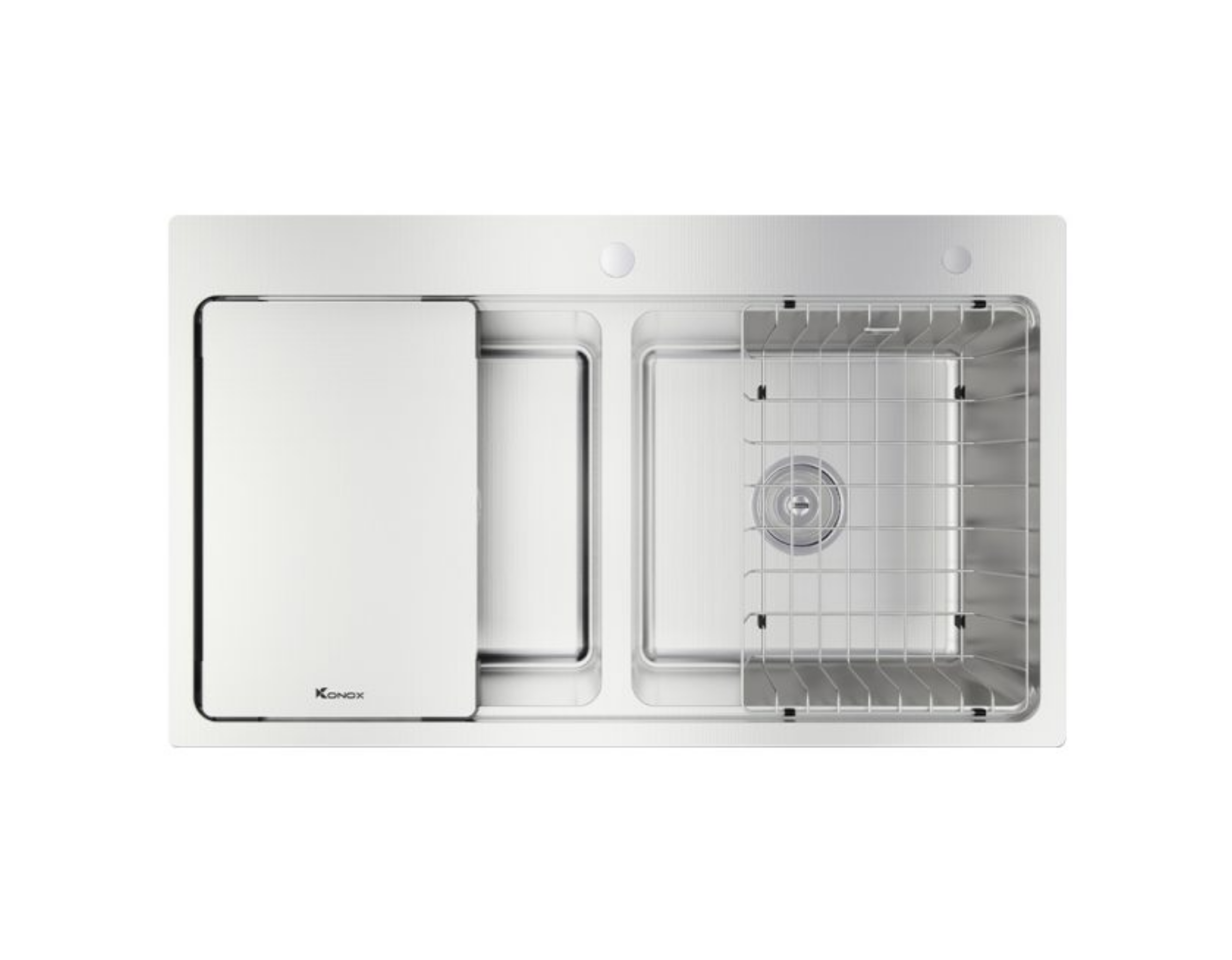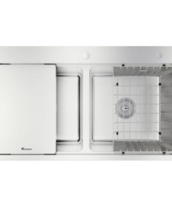 – Thiết kế hiện đại với gờ hạ bậc – tích hợp phụ kiện thông minh: Siphon, giá úp bát inox, thớt inox.