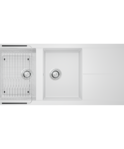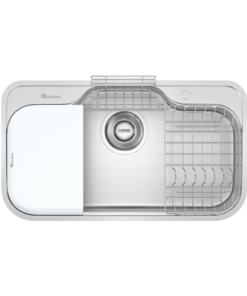 – Thiết kế hiện đại với gờ hạ bậc – tích hợp phụ kiện thông minh: Thớt nhựa, rổ úp bát, siphon.