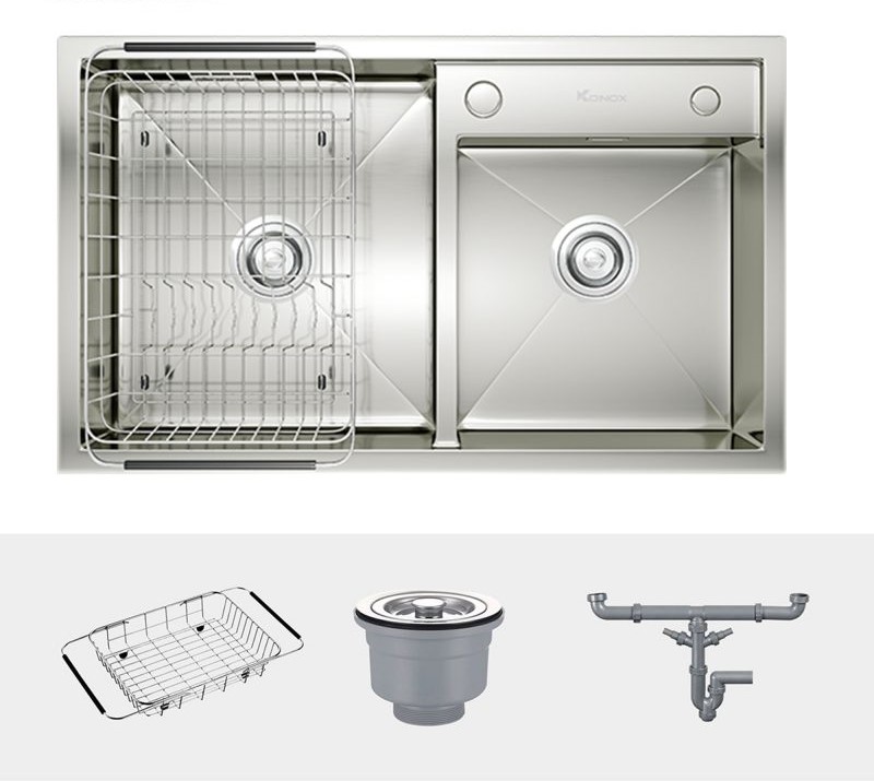 Chậu rửa bát Konox KN7847DO sử dụng thiết kế hai hố lệch, cho phép người dùng linh hoạt lựa chọn hố chậu theo từng mục đích sử dụng khác nhau. Cấu trúc hố lệch giúp phân chia công việc rửa thực phẩm và rửa bát đĩa một cách hợp lý, đồng thời hỗ trợ tiết kiệm nước trong quá trình sử dụng. Lòng chậu được thiết kế sâu giúp tăng dung tích hố rửa và hạn chế bắn nước ra ngoài, mang lại cảm giác thao tác gọn gàng và dễ chịu hơn khi sử dụng hàng ngày.