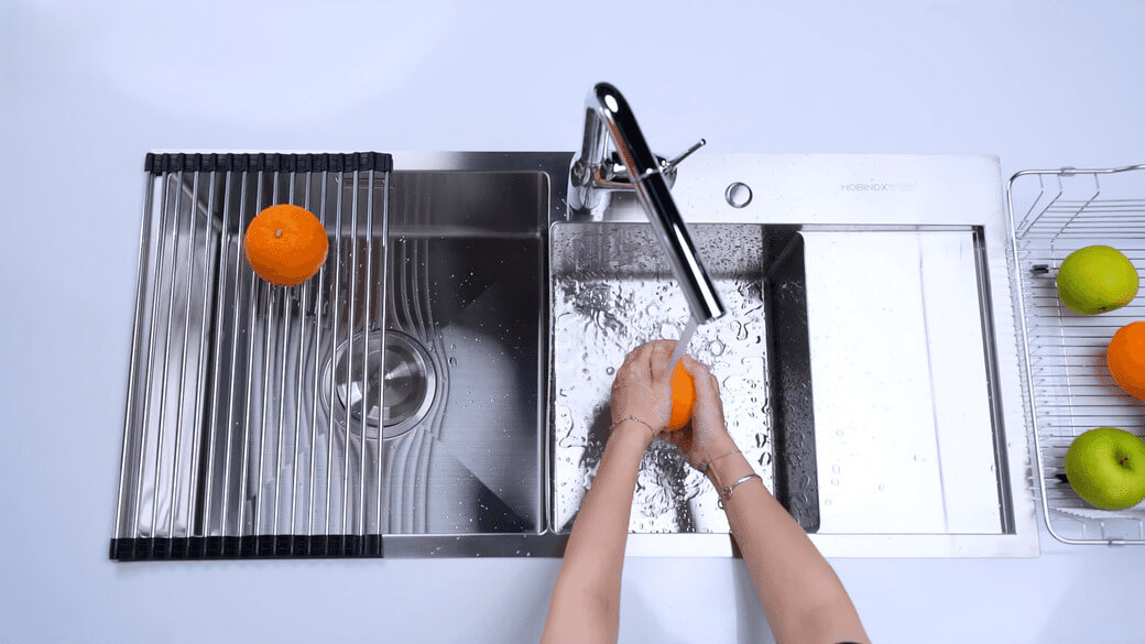 Nhờ đó, người dùng có thể thực hiện xuyên suốt các bước từ sơ chế, rửa đến để ráo ngay trên cùng một khu vực. Thiết kế này giúp rút ngắn thời gian thao tác, giảm di chuyển và giữ cho khu vực bếp luôn ngăn nắp.