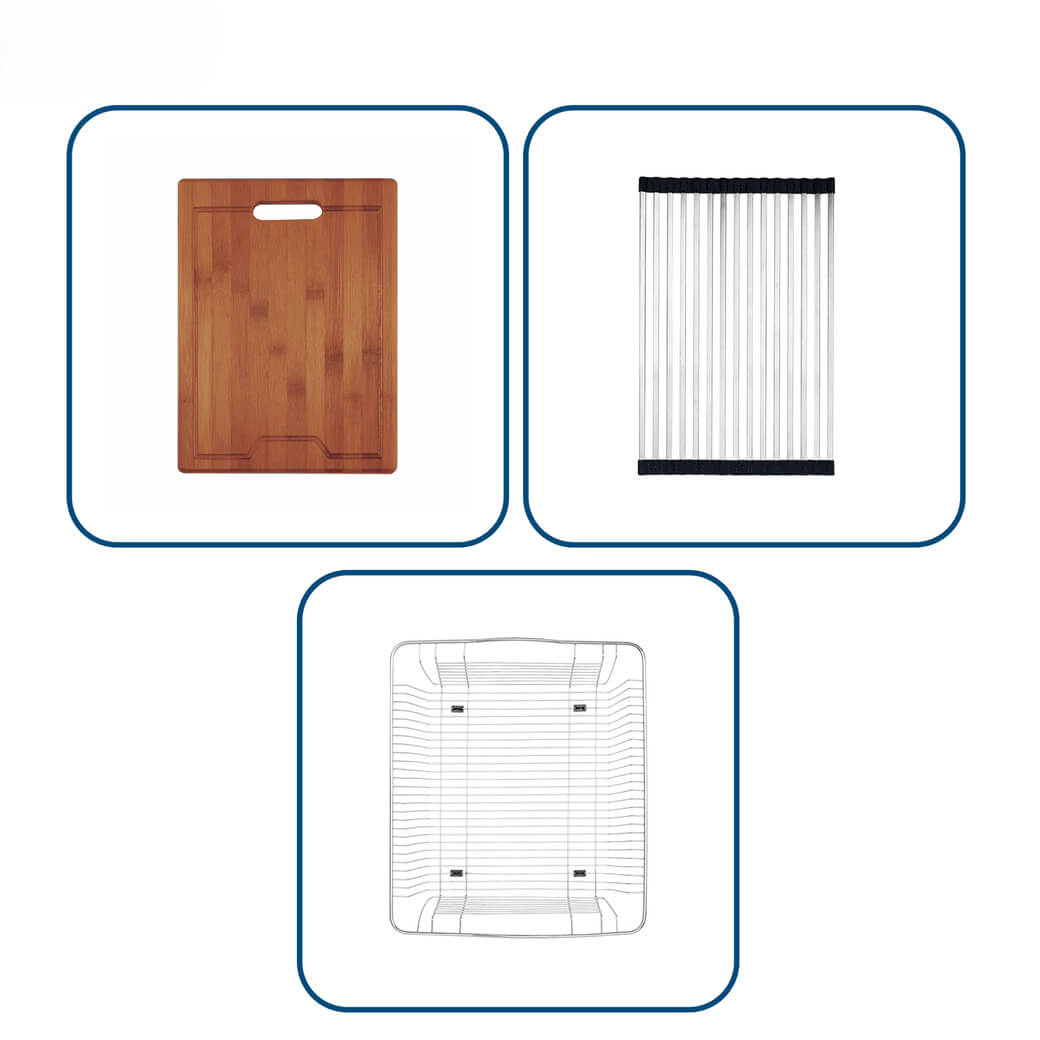 Một điểm kỹ thuật đáng chú ý của chậu rửa NOBINOX LIKEN NL748 là thiết kế hạ bậc trên thành chậu. Phần bậc thấp này được tính toán để tích hợp phụ kiện như thớt tre, rổ inox và bình đựng nước rửa bát một cách gọn gàng.