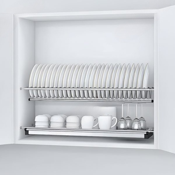 Thiết kế bắt trực tiếp vào thành tủ tạo nên liên kết chắc chắn giữa giá và hệ tủ bếp, giữ cho toàn bộ kết cấu không bị xê dịch khi chứa nhiều bát đĩa cùng lúc. Hệ khung và các thanh nan được bố trí đồng đều nhằm phân tán tải trọng trên toàn bộ bề mặt. Khả năng chịu lực lớn phù hợp với nhu cầu sử dụng thực tế trong gia đình có số lượng bát đĩa nhiều, nơi việc lưu trữ tập trung trong một khoang tủ yêu cầu kết cấu ổn định và bền bỉ theo thời gian.