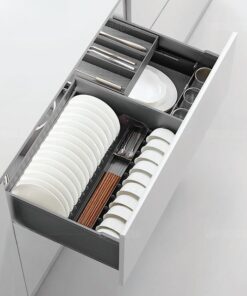– Mặt giá bằng phẳng kết hợp với hệ thống thanh chia chuyên biệt giúp cho bát, đĩa, đũa,… được xếp gọn gàng ngay trong ngăn kéo bếp.