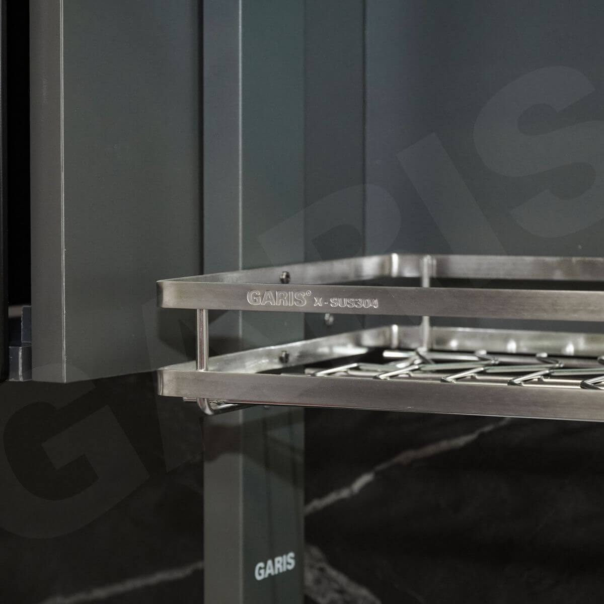 Giá bát đĩa nâng hạ điện Garis GL06LP được cấu tạo với hệ tủ ngoài bằng gỗ dày 18mm màu ghi xám hiện đại kết hợp cùng khung nhôm hàng không AA, tạo nên tổng thể chắc chắn, đồng bộ và phù hợp với nhiều phong cách tủ bếp hiện nay.