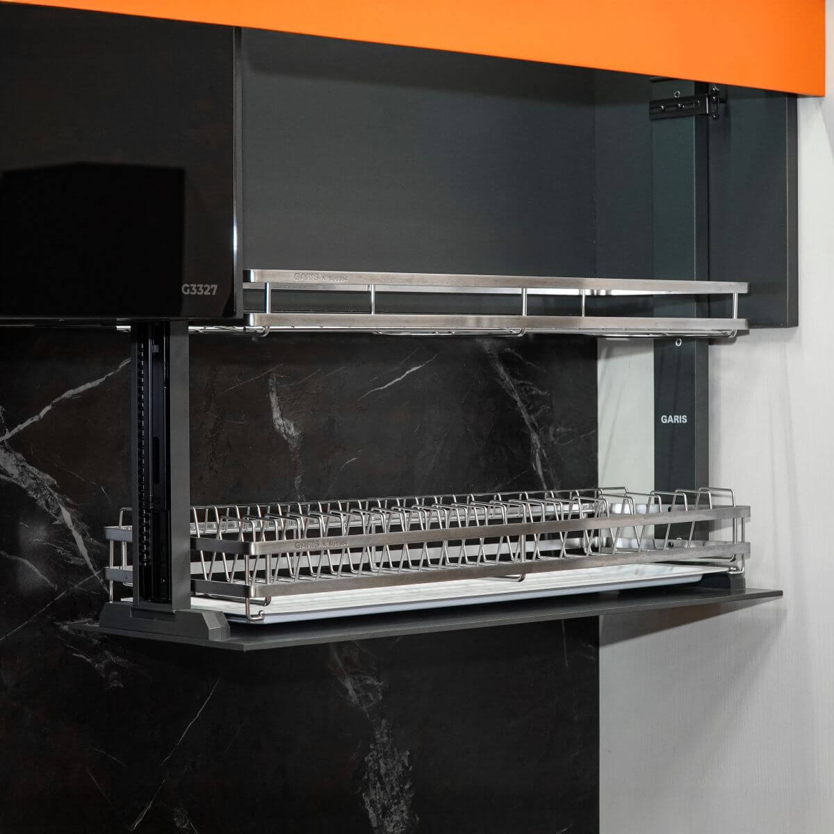 Giá bát đĩa nâng hạ điện Garis GL06LP sử dụng hệ thống cánh trượt mở lên, giúp tối ưu không gian phía trước tủ và không cần dùng tay nâng cánh như các thiết kế truyền thống.