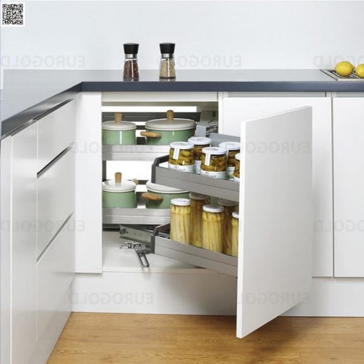Hệ góc liên hoàn Eurogold EU10 được lắp đặt âm tủ, tận dụng tối đa không gian bên trong mà không ảnh hưởng đến bố cục bên ngoài của hệ tủ bếp. Cấu trúc này phù hợp với nhiều loại tủ từ gỗ tự nhiên đến gỗ công nghiệp. Thiết kế gọn gàng giúp duy trì sự đồng bộ trong tổng thể nội thất bếp, đồng thời nâng cao hiệu quả sử dụng không gian tại khu vực góc vốn khó khai thác.