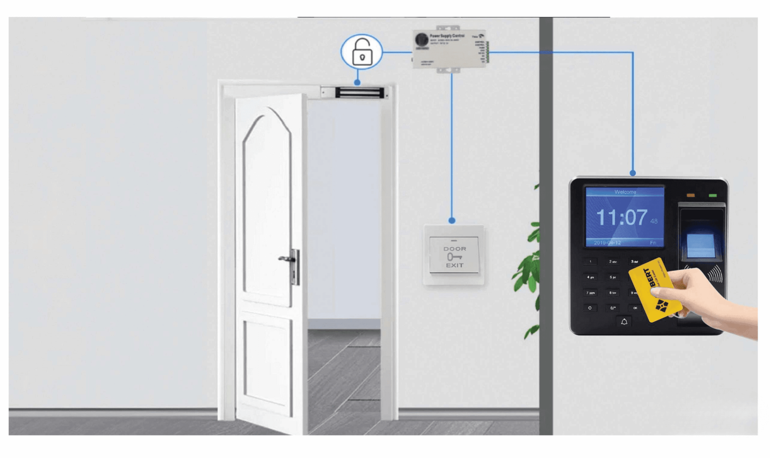 | Đặc điểm nổi bật | Chuông báo động, thẻ từ, Door exit, chốt gài nam châm, bộ nguồn 12VDC-5A, nam châm điện 180kg |
