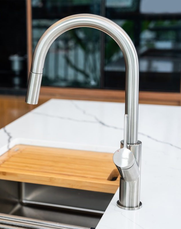 Vòi rửa bát Konox Ponte Nickel được thiết kế với chiều cao vòi phù hợp cho các thao tác làm bếp thường ngày như rửa nồi, chảo sâu hoặc sơ chế thực phẩm số lượng lớn. Dáng vòi cao kết hợp tay vòi ngang giúp không gian mặt bàn bếp phía sau chậu rửa được giữ gọn gàng.