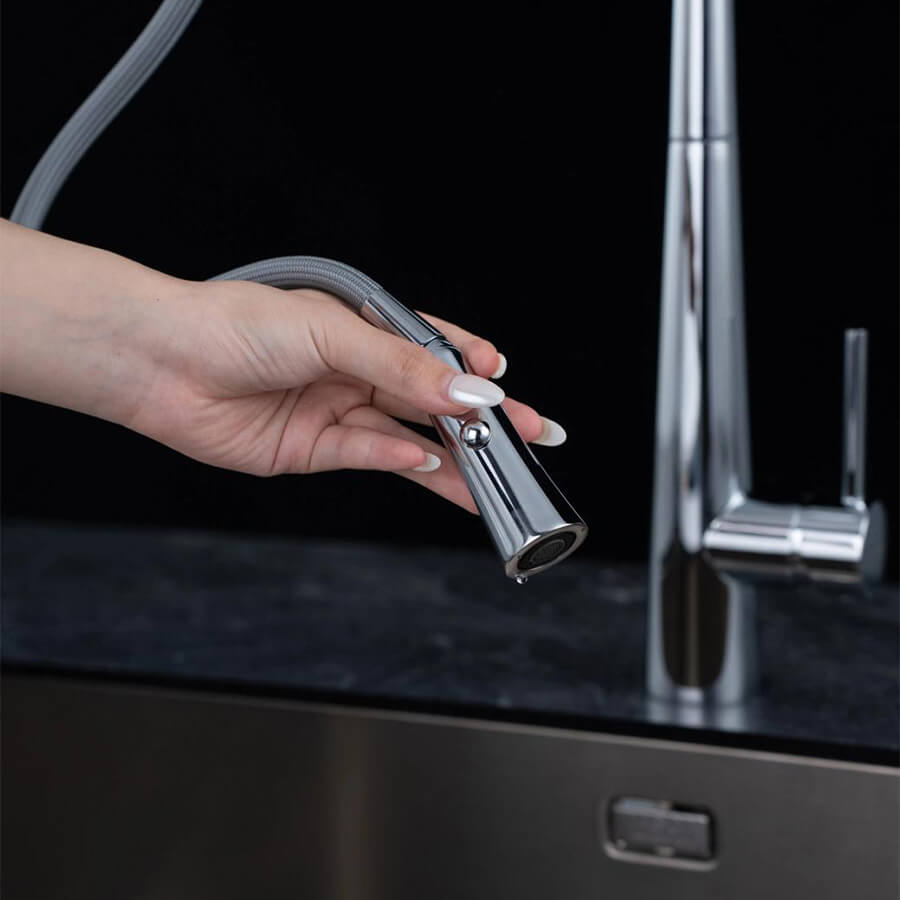 Một trong những ưu điểm đáng chú ý của vòi rửa bát Nobinox LOTUS 640 là thiết kế dây rút tiện lợi. Cấu trúc này cho phép đầu vòi được kéo ra khỏi thân vòi khi cần thiết, giúp người dùng dễ dàng điều chỉnh hướng nước đến nhiều vị trí trong chậu rửa.